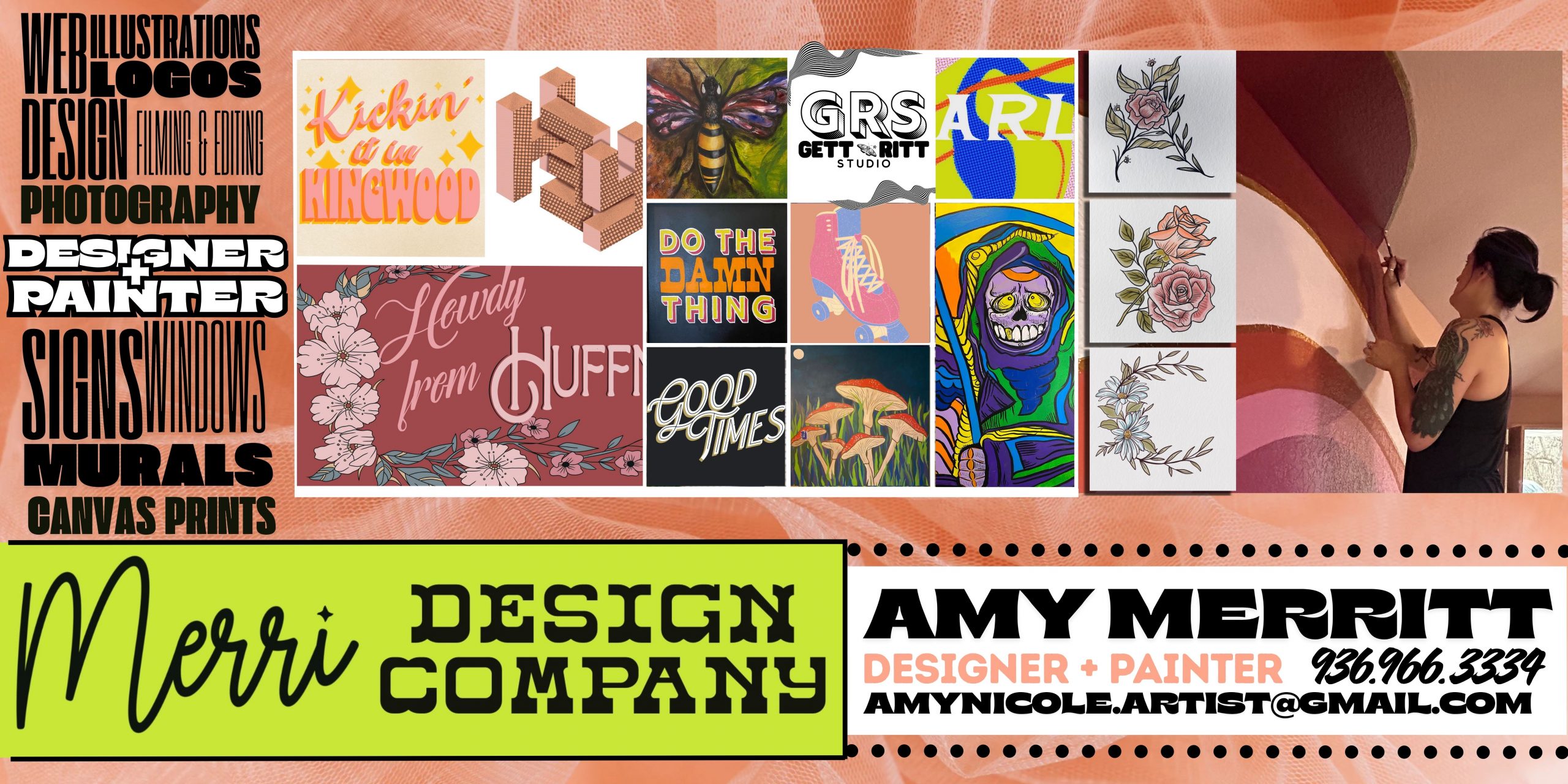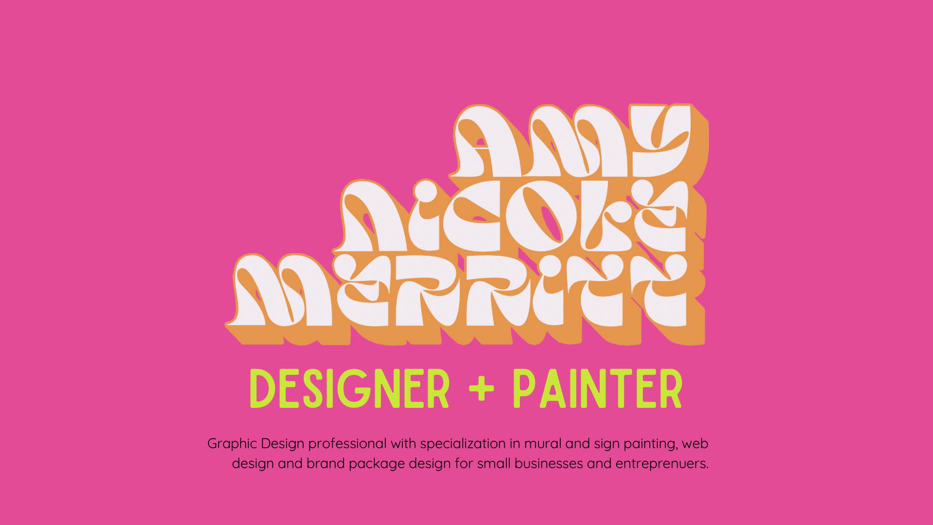 Building a foundation of over fifteen years in graphic design and over 20 years painting, typically in acrylic, Amy Merritt, founder of Merri Design Co., has extensive knowledge and skills in color theory, text, layout, font, logo creation and character illustration, making her an asset for all of your art direction needs. In her more recent years, she focused on strong lettering in sign painting and window hand-lettered paintings. In former roles with various companies, she gained experience in video editing, photography for social media and content creation as well as sound editing and synching with video. She has a strong interest in video production and post, for podcasts, talking head videos, action content, portraits, head shots and more.